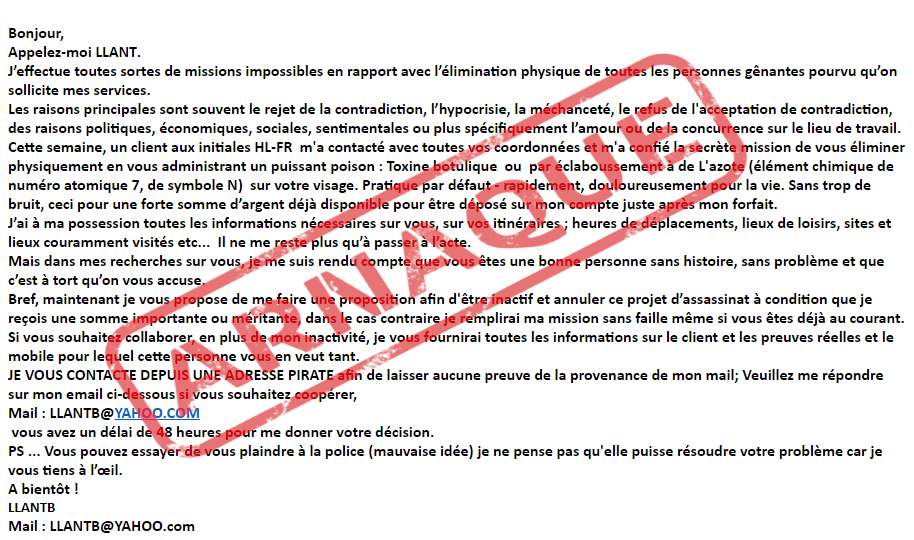 Plusieurs cas ont été signalés récemment à la Police, dans lesquels des personnes privées sont invitées par e-mail à verser de l'argent pour ne pas être victimes d'un prétendu assassin.