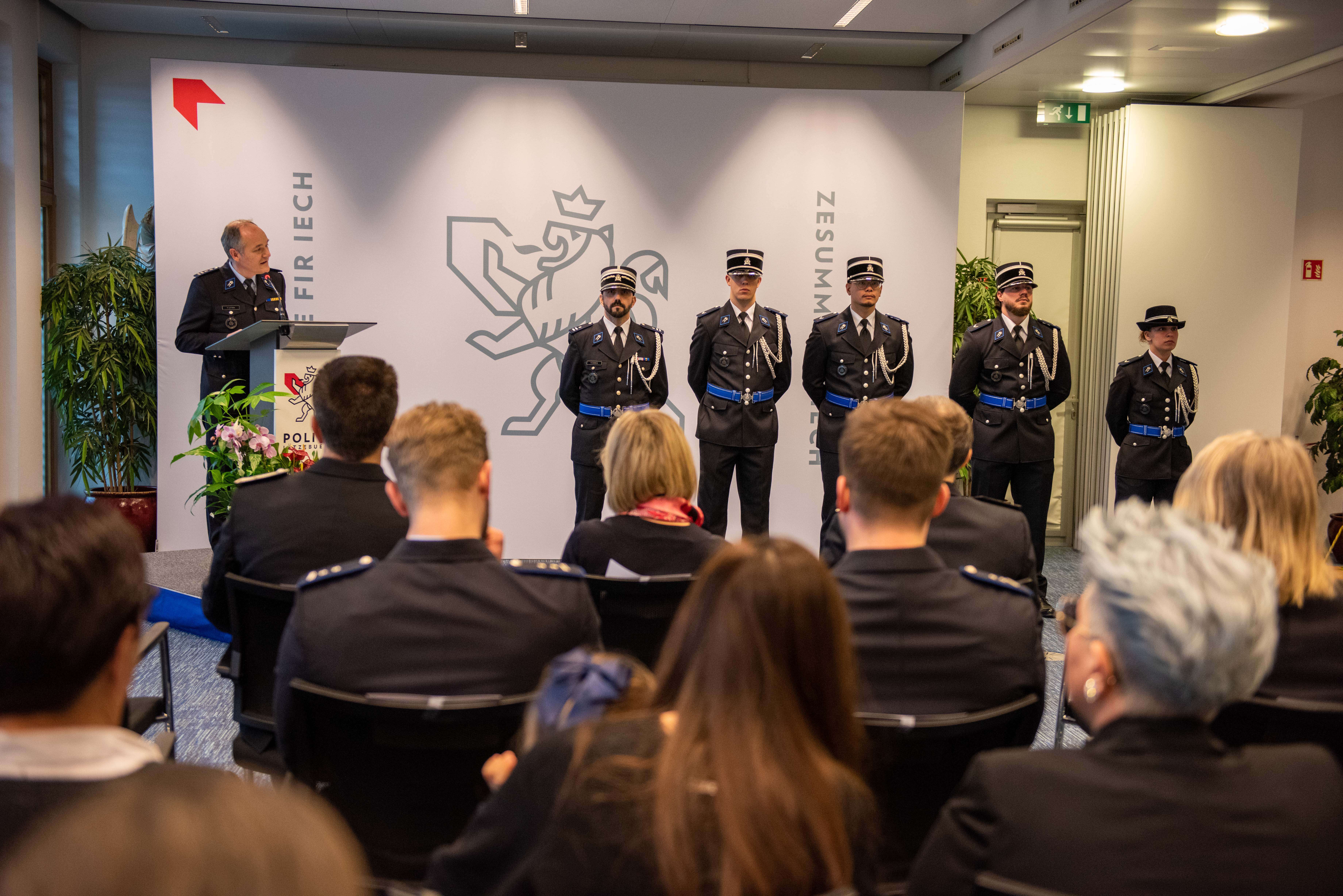 Après leur service militaire, les fonctionnaires stagiaires du cadre policier du groupe de traitement C2 suivent une formation professionnelle de base de 12 mois auprès de l'École de Police, composée d'une phase de formation policière théorique et pratique.