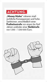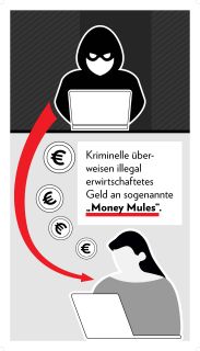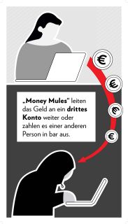 Dazu bedienen sie sich sogenannter "Money Mules". Diese Money Mules erhalten Geld von einem Bankkonto, das nicht ihr eigenes ist, und überweisen es auf ein anderes Konto oder heben es in bar ab und geben es gegen eine Provision an eine andere Person weiter.