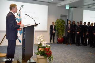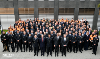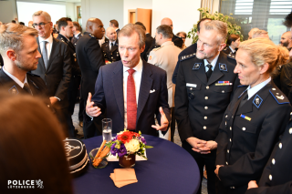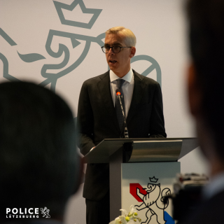 Après le passage d’une délégation de membres du Corps, composée d’une part d’un détachement représentant la diversité du Corps grand-ducal et d’autre part de membres du Service palais, une cérémonie s’est tenue à la salle Saint-Michel. À l’issue des allocutions du ministre Léon GLODEN et du directeur général Pascal PETERS, S.A.R. le Grand-Duc a échangé avec des membres du personnel de la Police.