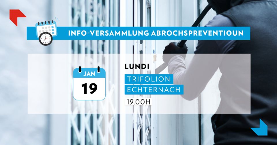 La Police organise régulièrement, en collaboration avec les communes, des soirées d'information sur le thème de la prévention contre le cambriolage, au cours de laquelle nos agents du Service national de prévention de la criminalité informent les intéressés sur les meilleures façons de se protéger contre les cambriolages.
