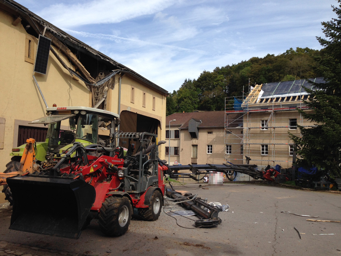 Le grutier voulait décharger justement des charges sur un toit, comme le camion-grue chancellait et se renversait. La flèche de grue tombait sur le toit du bâtiment d'en face, s'interrompait et endommageait encore un tracteur et une machine de travail. La rue était bloquée pour la circulation pour plusieures heures - jusqu'à conclusion des travaux de sauvetage.