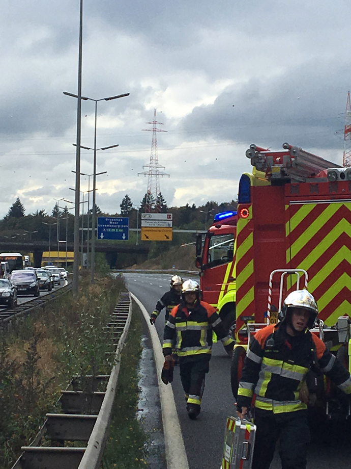 Gegen 14.50 Uhr wurde der Polizei ein Auffahrunfall zwischen drei Lastkraftwagen gemeldet. Der Unfall ereignete sich auf der A1, vom Senningerberg aus kommend, auf Höhe der Auffahrt auf die Autobahn A7 in Richtung Kirchberg. Augenzeugen gaben an, dass einer der Lkws mit hoher Geschwindigkeit auffuhr. Die Fahrerkabine wurde hierdurch eingedrückt.