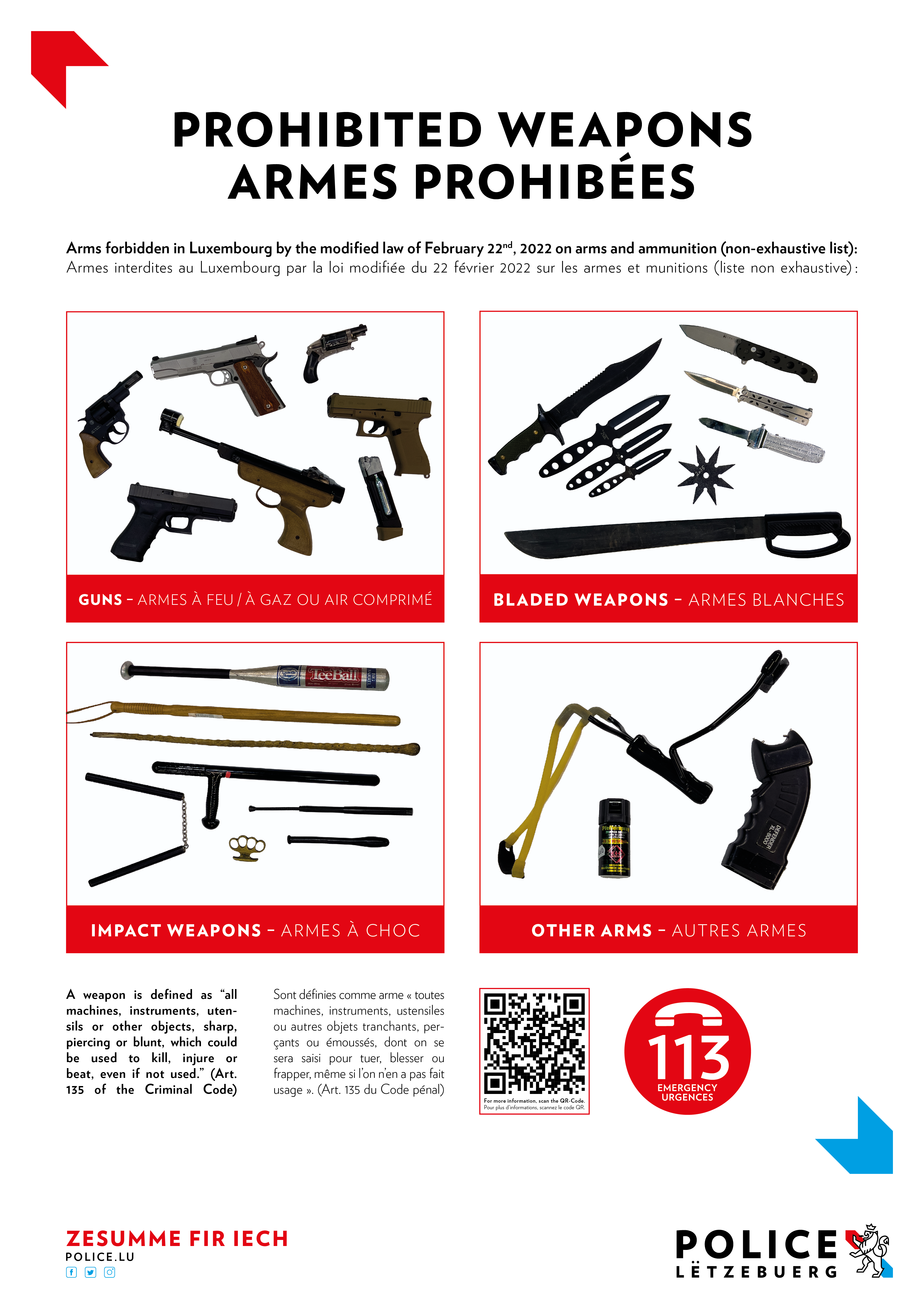 The Luxembourg Criminal Code defines a weapon as "any machine, instrument, utensil or other sharp-edged, pointed or blunt object taken up in order to kill, injure or strike, even if it is not used".