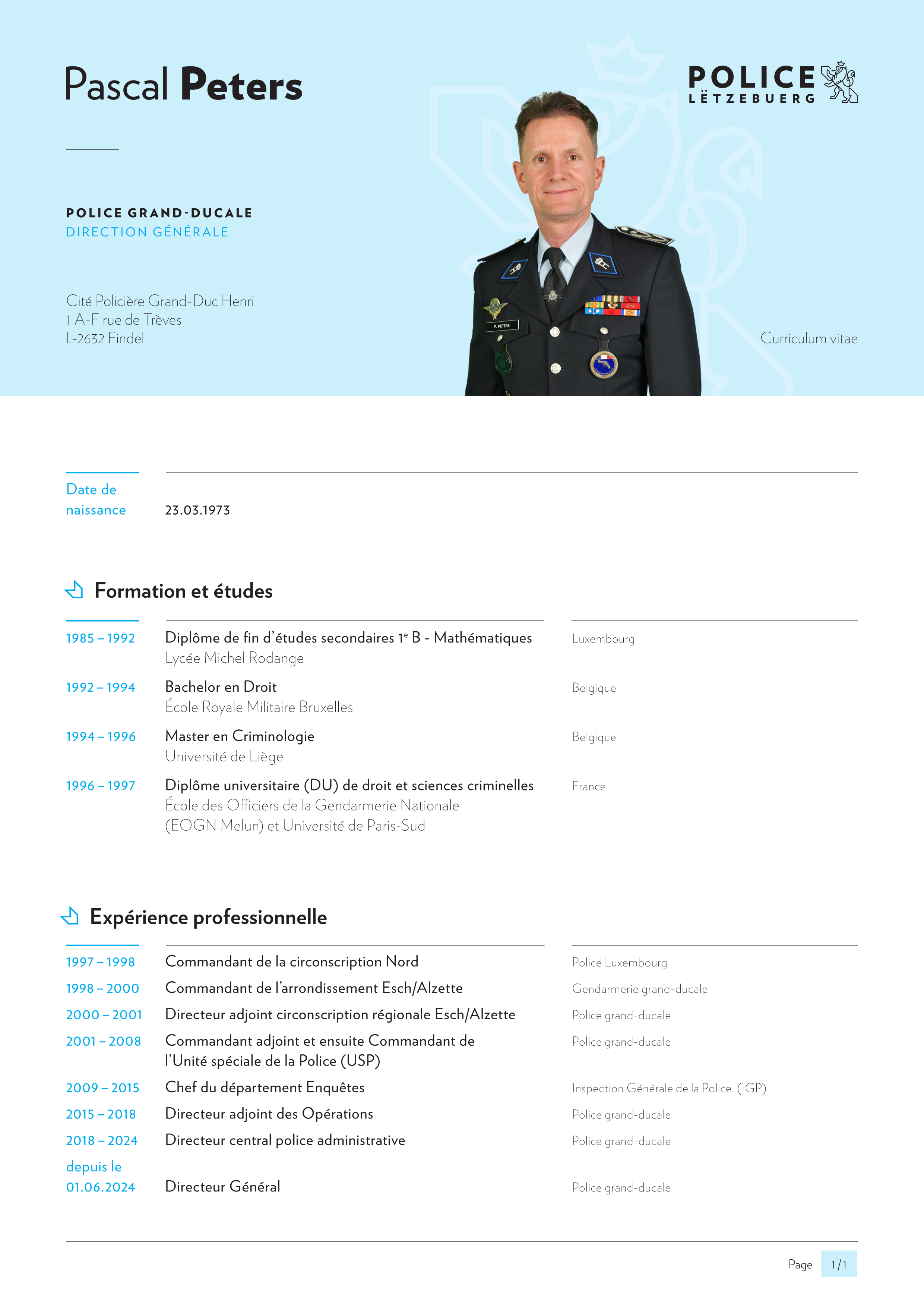 The Police are headed by a Director General who is assisted by a Deputy Director General. Since 2024, the role of Director General has been held by Pascal Peters. Alain Engelhardt is the Deputy Director General.