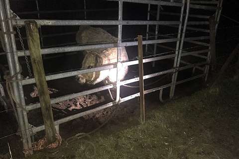 Die Polizei musste feststellen, dass das Rind tatsächlich jeweils mit einem dicken Seil rechts und linksseitig vom Kopf an einem Fanggitter angebunden war. Das Rind konnte sich kaum noch mit seinem Kopf bewegen. Des Weiteren stand das Rind mit seinen vier Hufen komplett im Schlamm und es hatte weder Wasser noch Futter. Das Rind wurde seitens der Polizei befreit und Protokoll wird gegen den Eigentümer/Halter wegen Tierquälerei errichtet.