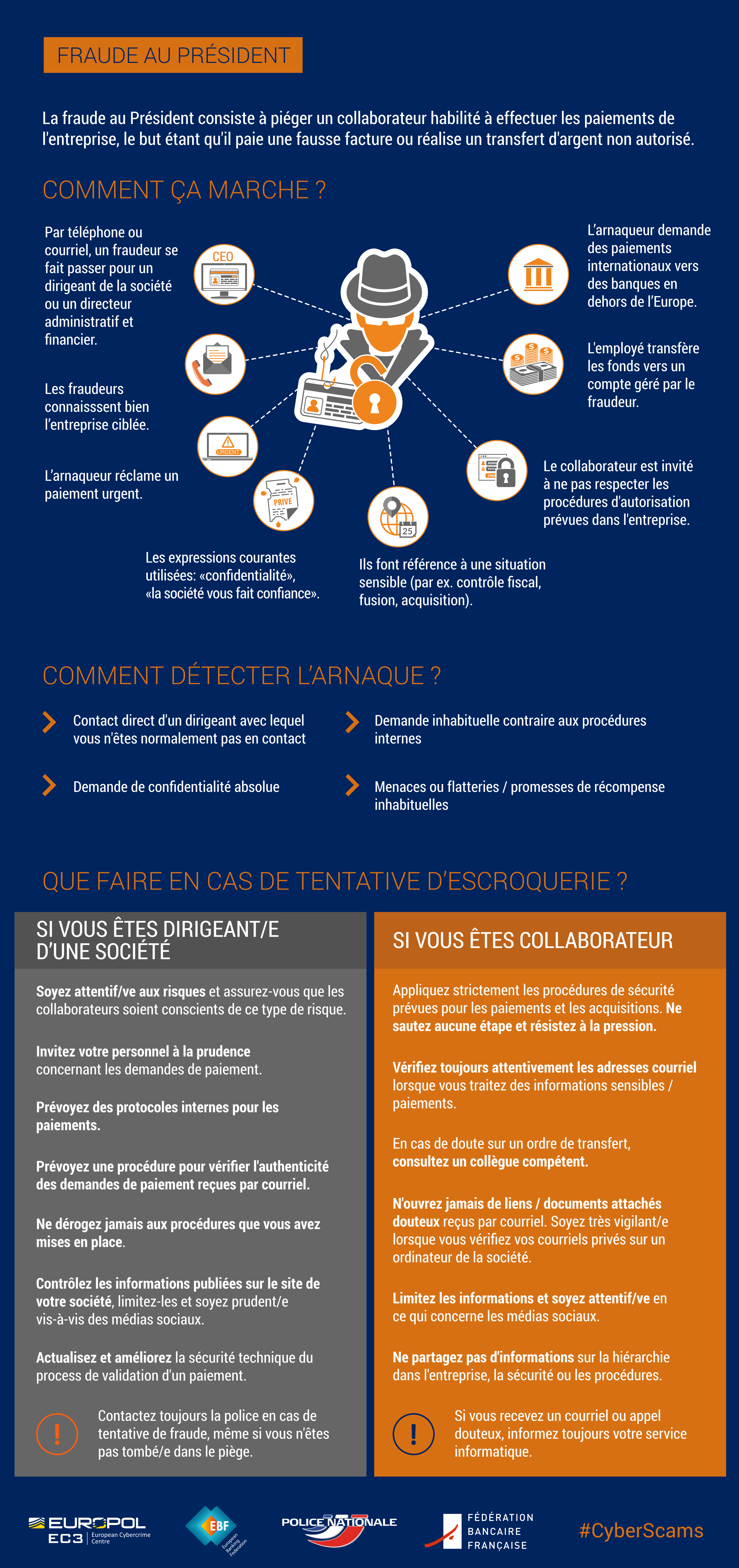 Cette arnaque (parfois appelée « arnaque aux faux ordres ») vise essentiellement les entreprises. L'objectif de l'arnaque est de piéger le collaborateur en le convainquant d'effectuer un transfert d'argent non autorisé.