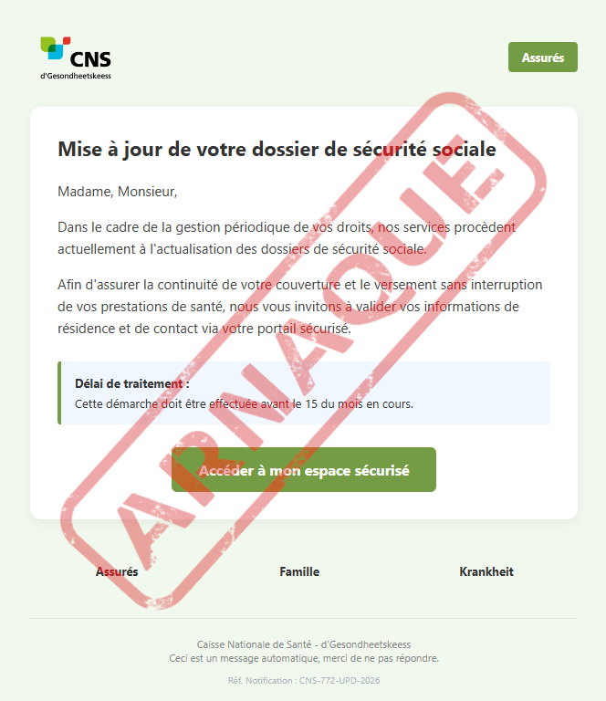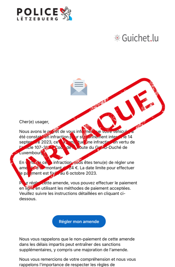 Depuis un certain temps, de nombreux cas d'E-Mails ou SMS frauduleux qui sont diffusés au nom d’institutions gouvernementales sont signalés à la Police.