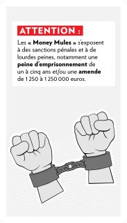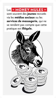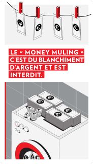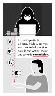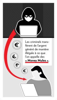 Pour faire ceci, ils utilisent des "Money Mules". Ces Money Mules reçoivent de l'argent d'un compte bancaire qui n'est pas le leur et le transfèrent sur un autre compte ou le retirent en espèces et le remettent à une autre personne en échange d'une commission.